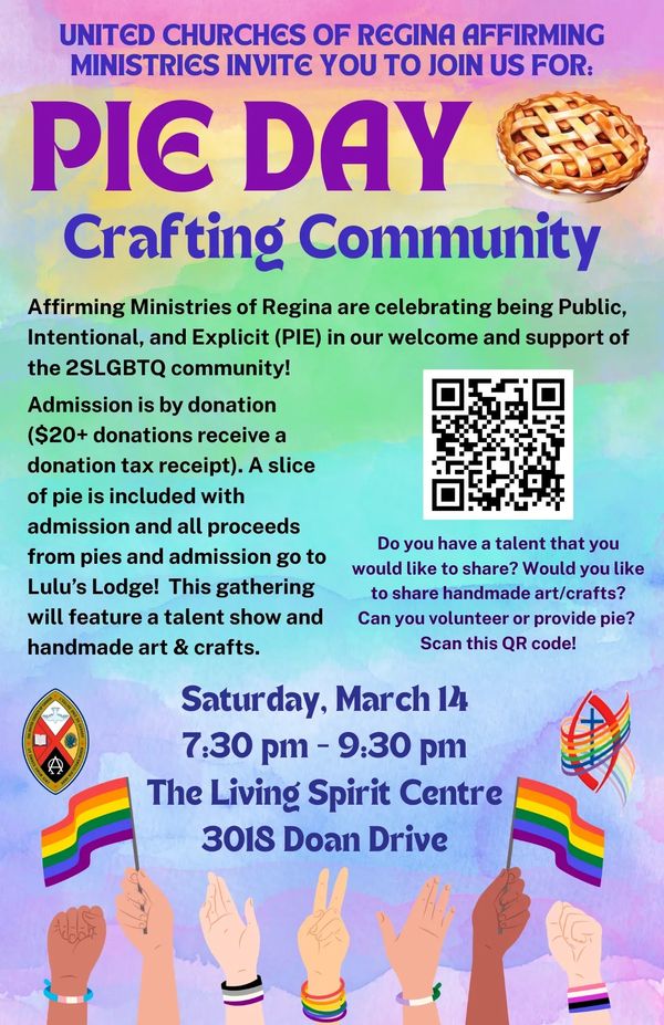 Join the Affirming United Churches in Regina for a PIE (Public, Intentional, and Explicit support of 2SLGBTQ+) Day Fundraiser for a fun evening of talent, art and craft, and pie in support of Lulu’s Lodge.